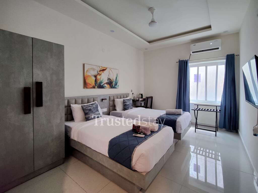This standalone Guest House features 78 well-appointed rooms, including 10 Executive Rooms and 68 Deluxe Rooms, designed to meet corporate accommodation standards. The ground floor includes a reception, restaurant, and in-house kitchen, while the first to fifth floors have 14 rooms each and the sixth floor has 8 rooms. All rooms have Electric Kettle and are equipped with split AC, television, and attached bathrooms, ensuring a comfortable stay. Mini Fridge can be provided on request at the time of Booking.